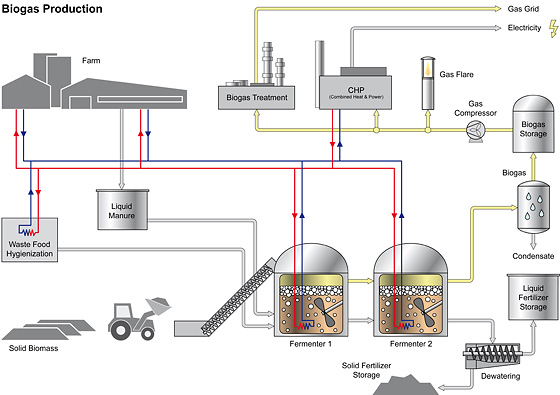 Το συγκεκριμένο γράφημα , δείχνει μία διβάθμια διαδικασία παραγωγής βιοαερίου εντός του χωνευτήρα. Η πρώτη ύλη , αποτελείται κυρίως απο τρία διαφορετικά είδη πρώτης ύλης : κόπρανα , ενεργειακές καλλιέργειες και οποιοδήποτε οργανικό απόβλητο απο βιομηχανιές τροφίμων . Όλα τα βιοαποκοδομήσιμα υλικά όπως ενσίρωμα καλαμπόκι , γρασίδι , τροφικά απόβλητα , απόβλητα εργοστασίων τροφίμων , υποπροιόντα λαχανικών καθώς και κάθε μορφής υποπροιόντας προερχόμενο απο επεξεργασία φρούτων , μπορούν να χρησιμοποιηθούν επίσης ως πρώτη ύλη προς χώνευση.